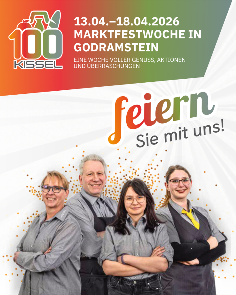 Marktfestwoche in Godramstein 13.04. bis 18.04.2026 Der Auftakt ins Jubiläumsjahr – wir feiern 100 Jahre Kissel! Mit der Marktfestwoche in Godramstein startet unsere große Jubiläumsreihe